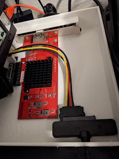 The case extender was designed by me, which allows a single slot PCI-e card to be installed and has a hole on the side to allow a screw driver to affix an M3 screw to secure the card, and a slot in the back to pass the USB to SATA cable through.